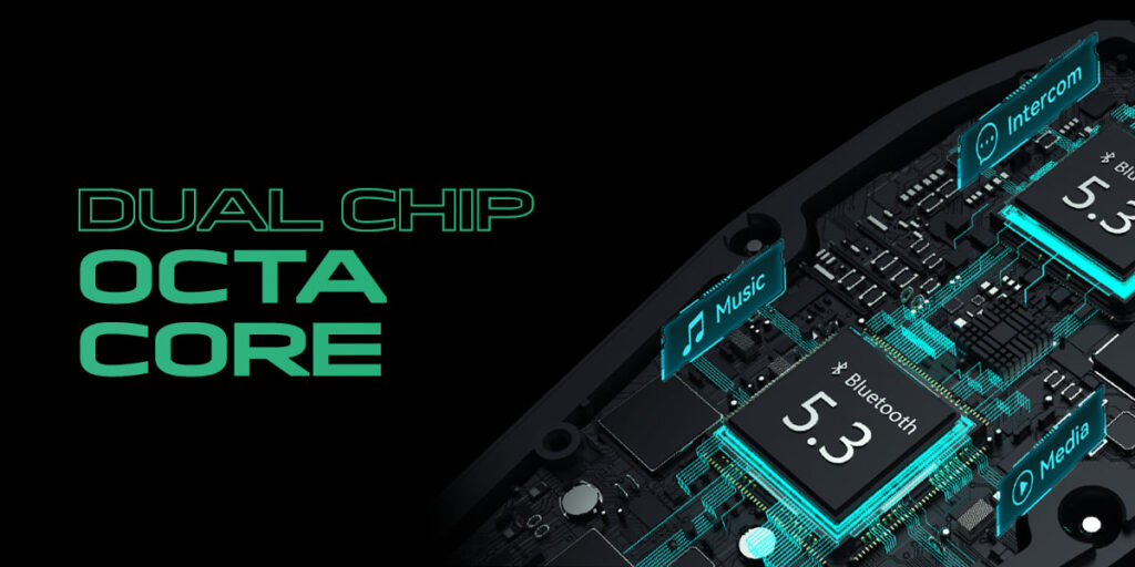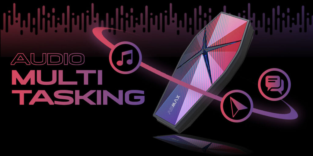 ASMAX F1 Pro helmet communication systems features audio multitasking that enables simultaneous enjoyment of music and group intercom or GPS navigation.
